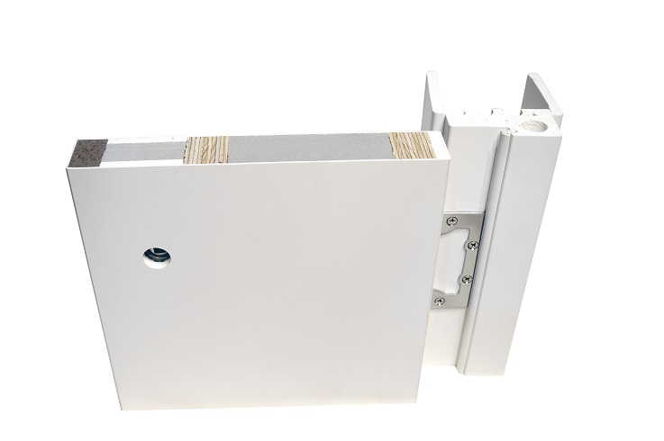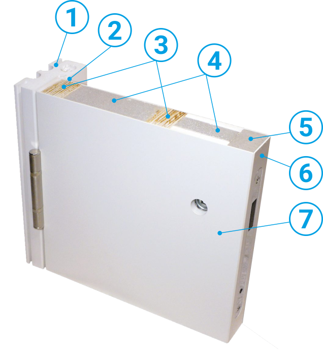 - Дверное полотно конструктивно представляет cобой каркас из LVL- бруса, заполненный экструзионным пенополистиролом и облицованный термоустойчивым ПВХ-листом толщиной 1,5 мм, с заводской врезкой под замок. Торцы скрыты кромочной ПВХ-лентой. Место установки замка усилено ДПК-брусом.