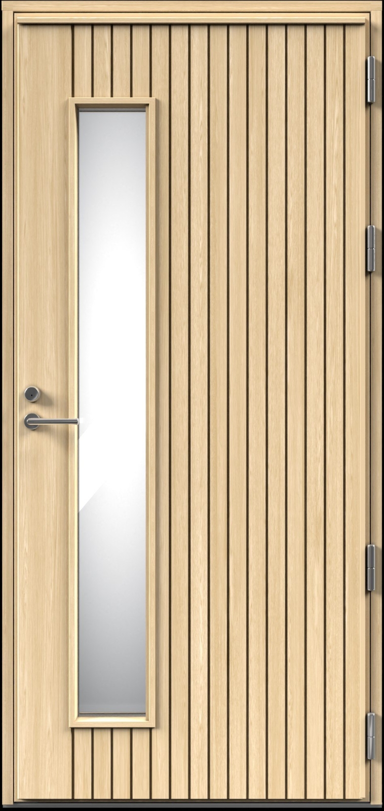 - Дверное полотно многослойной конструкции с утеплителем из древесноволокнистой плиты Ekovilla и поверхностями из панелей бессучковой сосны, покрытых морилкой.